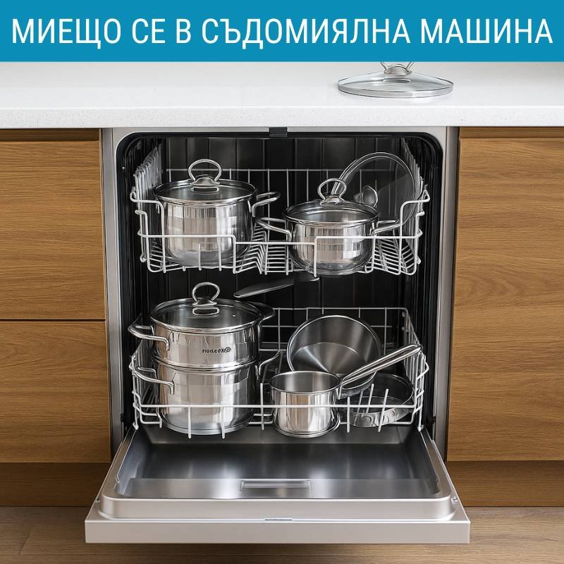 Тайната му е в конструкцията от неръждаема стомана с трислойно дъно, което разпределя топлината равномерно, гарантирайки перфектно готвене без залепване на храната по дъното.