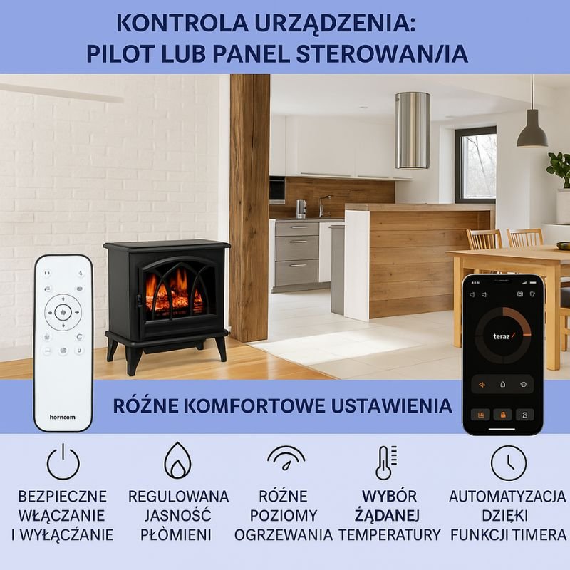 Ustaw temperaturę, timer i kontroluj kominek bezpośrednio przez aplikację lub pilota, aby zarządzanie było łatwe i wygodne