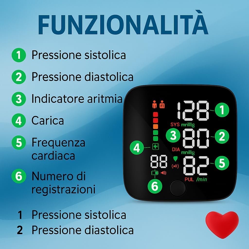 Un misuratore da polso che fa tutto lui: lo indossi, premi e inizia. La voce in italiano ti dice cosa fare e ti legge i valori, così non sbagli. Il display grande resta chiaro anche la sera. Memoria per due persone, avviso su battito irregolare e batteria USB: pronto in casa o in viaggio con custodia inclusa per tenerlo sempre protetto.
