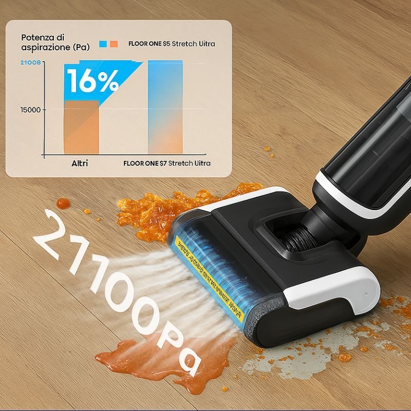 Мощен и тих, измива, абсорбира и изсушава всяка повърхност само с едно движение и без усилие. Подходящ за всички видове повърхности като: паркет, порцеланов гранитогрес, ламинат, мокет, мрамор, дърво, килими, луксозни подове и много други! Почиства площ от 360 m² с едно зареждане