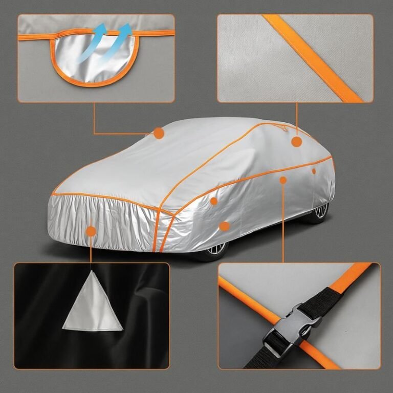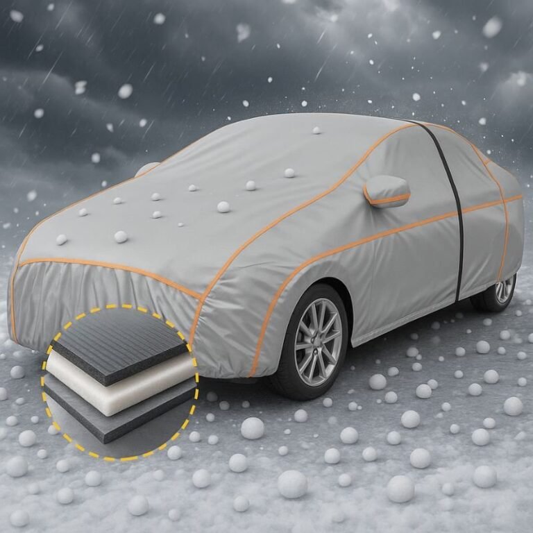 Realizzato con fibra UltraShield™ rinforzata con trama carbonica e imbottitura da 5 mm protegge tetto vetri lunotto e specchietti da grandine fino a 15 mm vento forte gelo invernale e raggi solari mantenendo l’auto fresca anche sotto il sole estivo