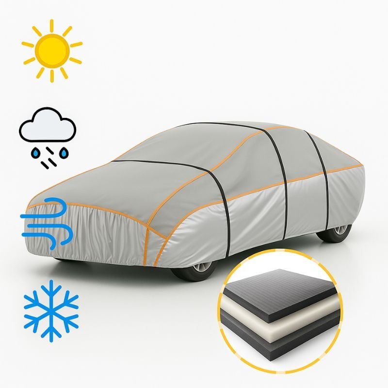 Grazie alla speciale imbottitura da 5 mm con fibra UltraShield™, il telo assorbe e disperde l’impatto di grandine fino a 15 mm, proteggendo la carrozzeria anche durante violenti temporali. Una barriera efficace contro neve, gelo, sole e vento, per un’auto sempre al sicuro in ogni stagione