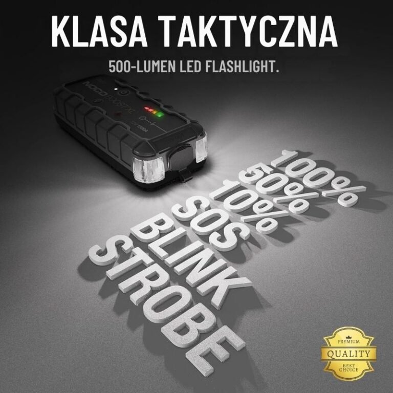 Wbudowana latarka LED o mocy 500 lumenów zapewnia wyjątkowo mocne światło, idealne w sytuacjach awaryjnych, podczas pracy nocą lub przy słabej widoczności. Możesz wybrać jeden z kilku trybów świecenia — 100%, 50%, 10%, SOS, Blink oraz Strobe — aby dopasować jasność do każdej potrzeby. Niezastąpiony dodatek taktyczny, który zamienia booster w kompletne narzędzie gotowe na każdą sytuację.